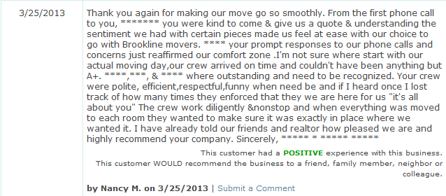 Moving.com does not filter for positive or negative reviews but does verify the review against the moving company information. ** The information displayed may not be current. For the most recent information, please visit www.bbb.org. This website/application is not sponsored, endorsed, owned by or affiliated with BBB. ... Fetch Here